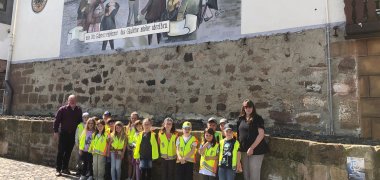 Kinder zeigten sich sehr interessiert und bekamen als Belohnung eine Kleinigkeit zum Verzehr. Im Anschluss machten die Klasse ein Foto auf der Freifläche vor dem Gemälde von Nikolaus Geier zusammen mit Bürgermeister Liebermann.